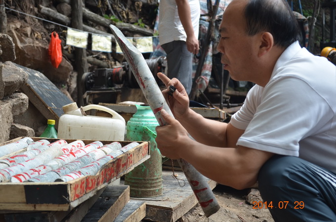 該項(xiàng)目是我隊(duì)繼小秦嶺整裝勘查潼關(guān)自有礦權(quán)區(qū)中深部探礦系統(tǒng)工程之后的又一探礦項(xiàng)目。在總公司領(lǐng)導(dǎo)的關(guān)心支持下,隊(duì)主要領(lǐng)導(dǎo)非常重視,多次前往項(xiàng)目實(shí)施地進(jìn)行現(xiàn)場檢查指導(dǎo)。目前,項(xiàng)目相關(guān)手續(xù)辦理及鉆探施工正有序進(jìn)行,總體進(jìn)展順利,鉆孔不同深度見有多層礦化。在檢查ZK503提取的巖心時(shí),王隊(duì)長手持地質(zhì)放大鏡仔細(xì)查看,他要求施工和相關(guān)技術(shù)人員要隨時(shí)注意巖心變化情況,特別對不同標(biāo)高段出現(xiàn)的不同地質(zhì)情況要認(rèn)真記錄、仔細(xì)分析、及時(shí)報(bào)告,不能漏掉任何細(xì)節(jié)。