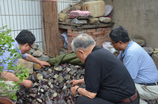 上山察看后,老部長又來張華溝礦點(diǎn)劉吉村村民王新海的院子,察看了當(dāng)?shù)卮迕耖_采的瑪瑙礦石,調(diào)研瑪瑙石礦民采情況,并在村民院子,饒有興趣的與我隊(duì)寶玉石礦項(xiàng)目部技術(shù)人員和村民進(jìn)行了交流,關(guān)切地詢問技術(shù)人員的數(shù)量、生活及車輛租用費(fèi)用等情況。項(xiàng)目負(fù)責(zé)高虔認(rèn)真地一一回答了老部長的問詢。