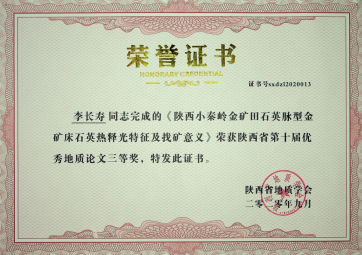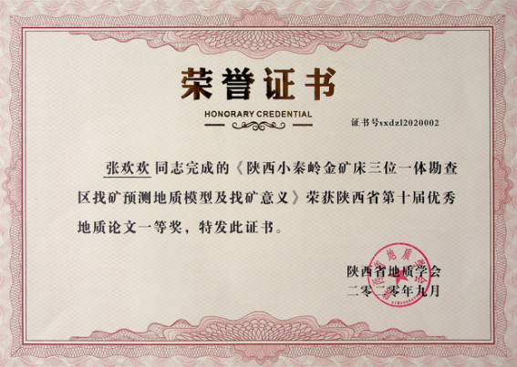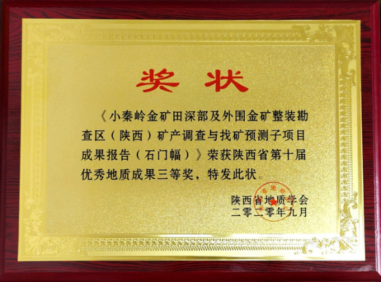 由我公司地調(diào)所編制完成的“小秦嶺金礦田深部及外圍金礦整裝勘查區(qū)(陜西)礦產(chǎn)調(diào)查找礦預(yù)測子項(xiàng)目(石門幅)成果報(bào)告”獲陜西省第十屆優(yōu)秀地質(zhì)成果三等獎(jiǎng);張歡歡同志撰寫的“陜西小秦嶺金礦床三位一體勘查區(qū)找礦預(yù)測地質(zhì)模型及找礦意義”獲優(yōu)秀地質(zhì)論文一等獎(jiǎng);李長壽同志撰寫的“陜西小秦嶺金礦田石英脈型金礦床石英熱釋光特征及其找礦意義”獲優(yōu)秀地質(zhì)論文三等獎(jiǎng)。
